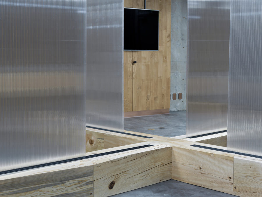 The base for the removable panels, the base for glass partition and the long bench by the window are all made by extraordinarily huge section of pine wood traditionally used as main column of Japanese wooden houses. The appearance of this wood volume is what characterizes the space. Each wood volume is carefully combined with metal fixtures having distinct functions and shows an interesting contrast between the rough wooden existence and delicate details.