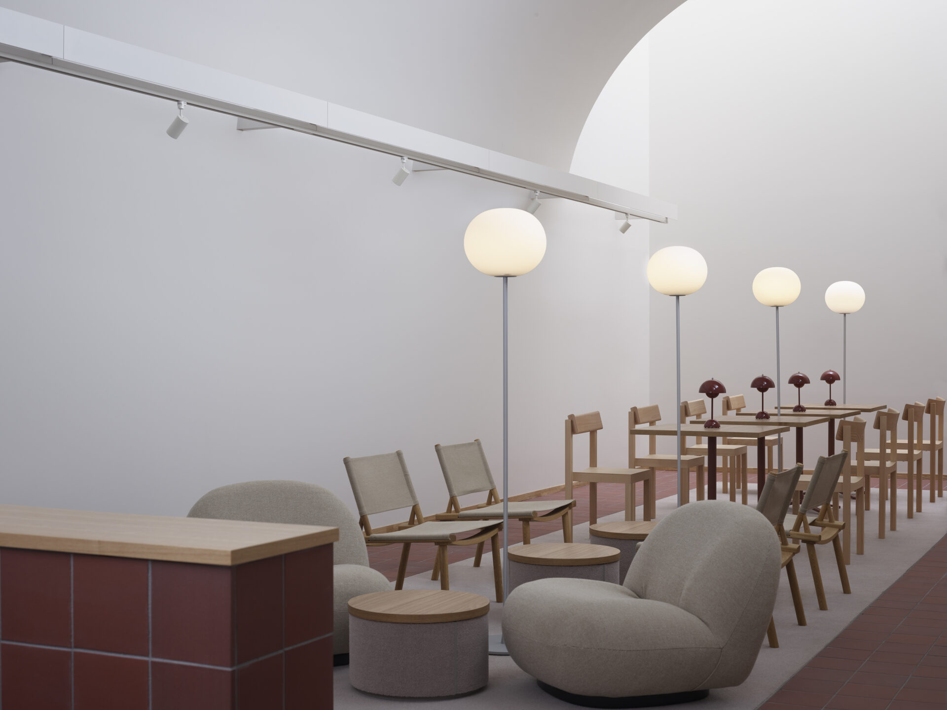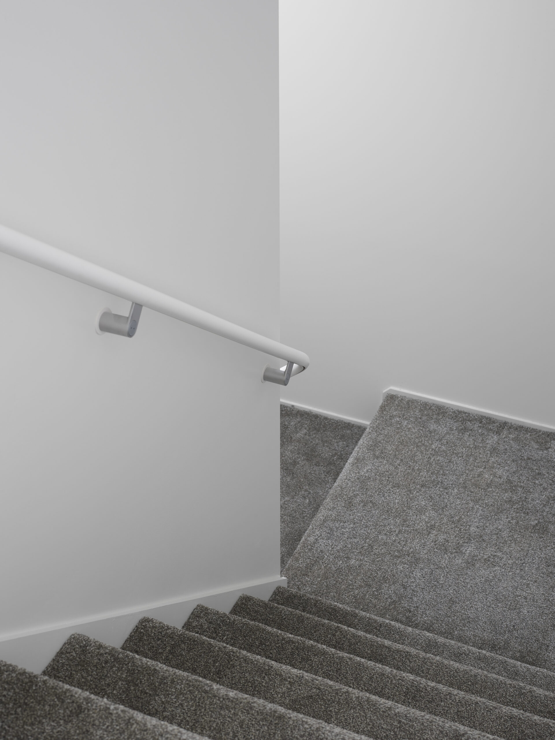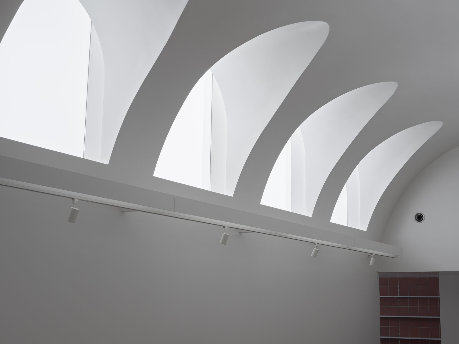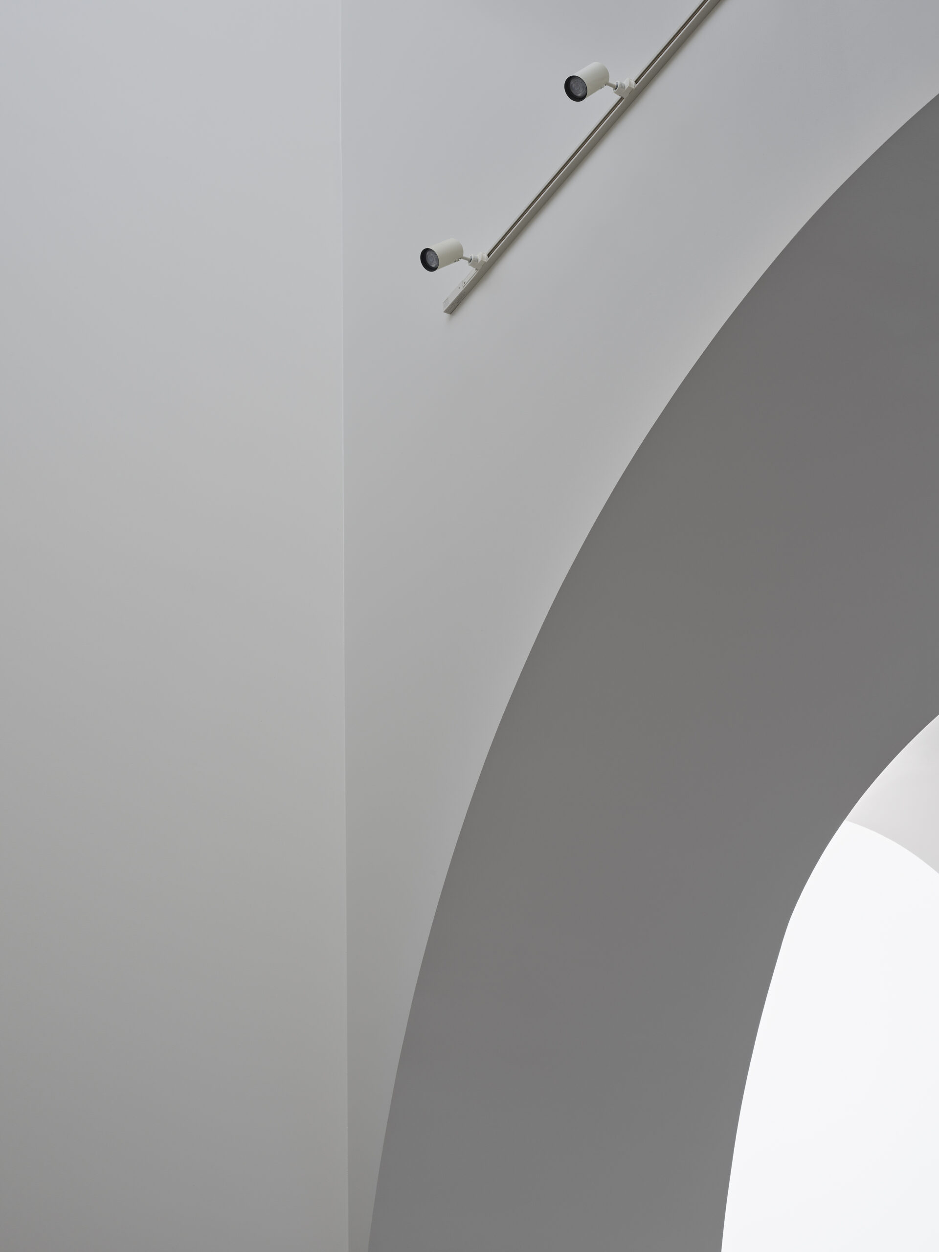 The lounge sits directly next to glass-fronted retail spaces, so we added windows in the wall between the lounge and the shops, allowing some of the natural light entering the shops to flow into the lounge. Soft light now filters in from each shop through high sidelights. With a slightly curved ceiling, this light spreads out, filling the room. At the far end of the tunnel-like space, there’s an atrium, allowing light to pour down from the upper floors like a skylight.