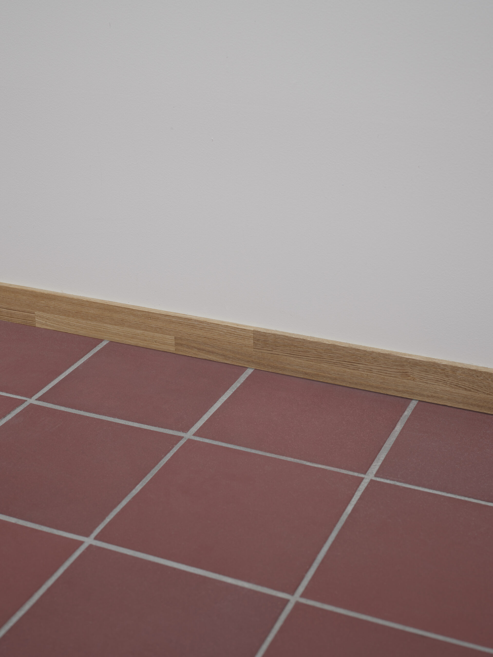 In the center of the lounge, a soft carpet is laid out, with furniture neatly arranged upon it. The hard terracotta-tiled floor surrounding this area occasionally transforms into furniture or even walls. The grey grout between the tiles sometimes serves as shelving rails or shelves themselves.