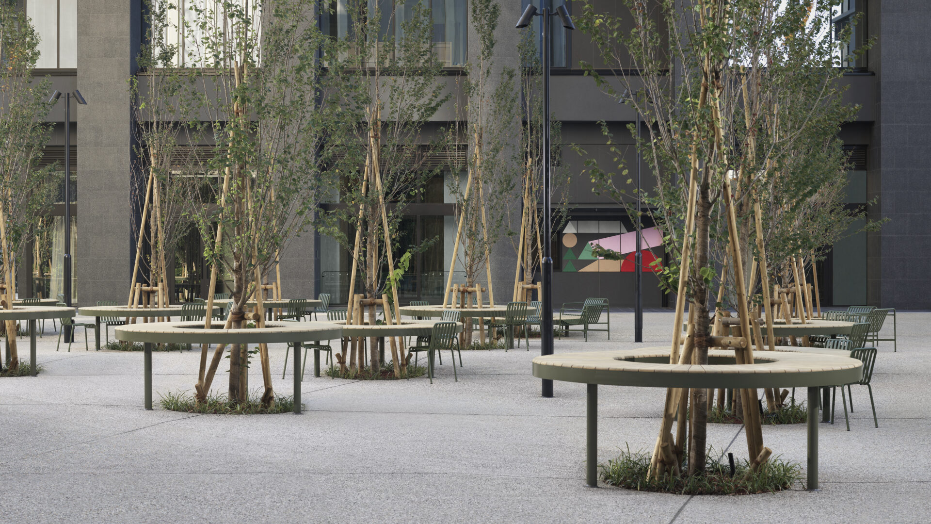 Within the site of the MEGURO MARC complex in Meguro, we designed a pocket park placed in a triangular space surrounded by a tower and office building. Before starting the project, as I looked at the site plan I had been given, I vaguely recalled Paley Park, a place I had instinctively wandered into when I was tired of walking around New York.