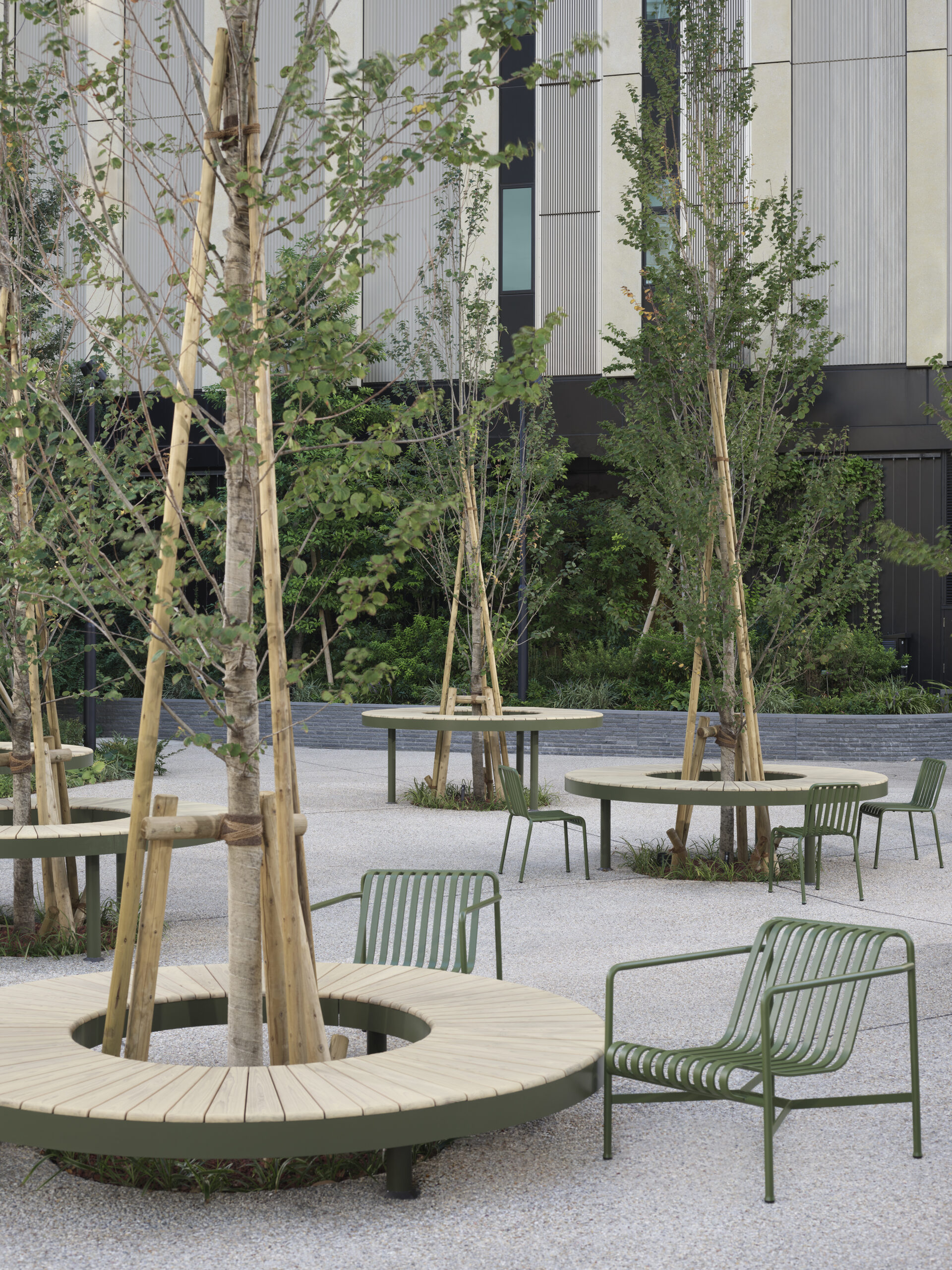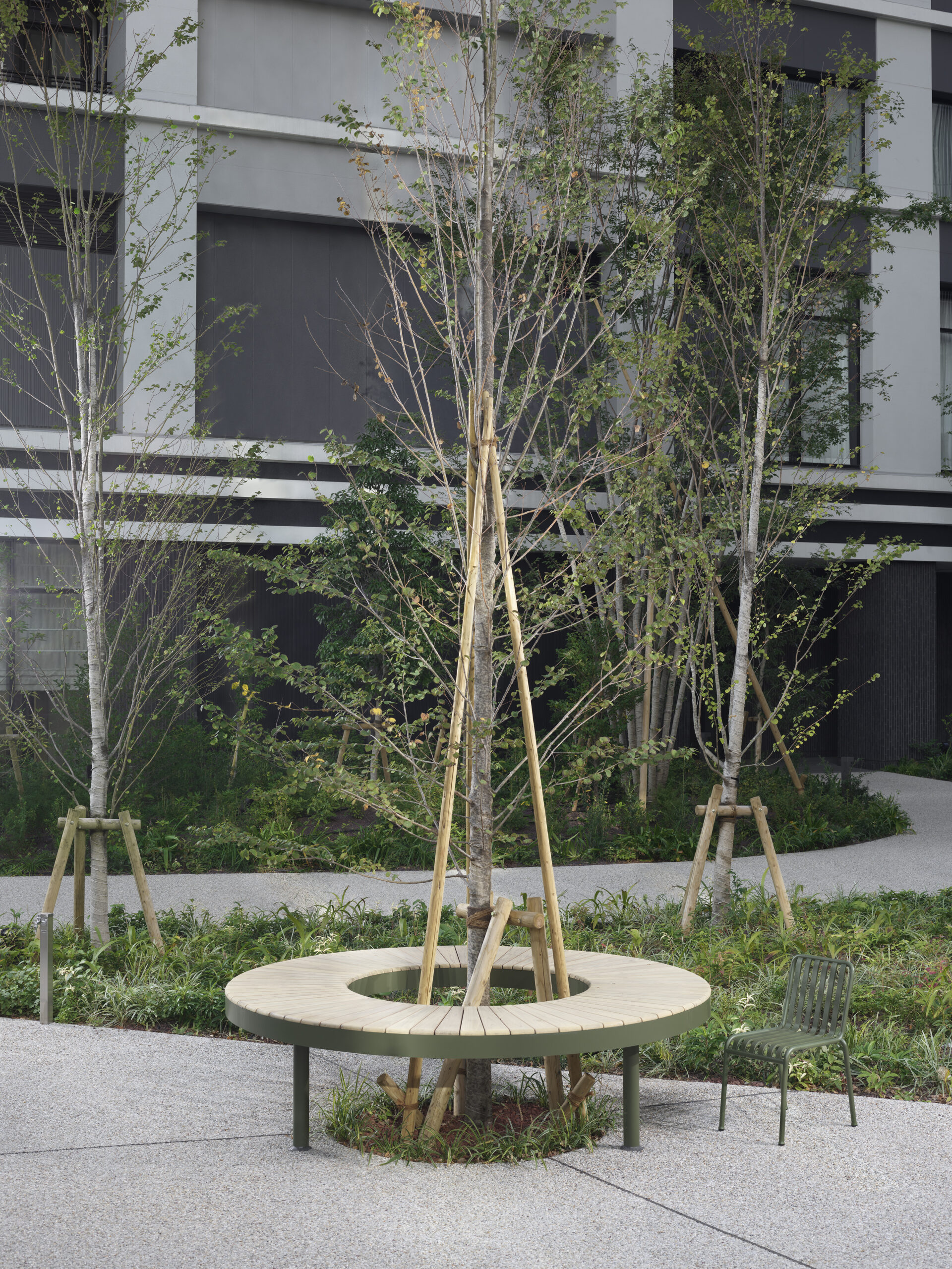 We have always liked parks where trees are planted in a grid. Each tree stands with plenty of space, allowing its unique character to shine through. The black locusts of Paley Park, the horse chestnuts of the Luxembourg Garden, the ginkgo trees of the Meiji Jingu Gaien, the plane trees of Shinjuku Gyoen – for MEGURO MARC, we chose the katsura tree. In summer, its leaves grow thick and provide shade; in winter, they fall, allowing warm sunlight to pour through. The fallen leaves give off a sweet scent, reminiscent of caramel or cotton candy.