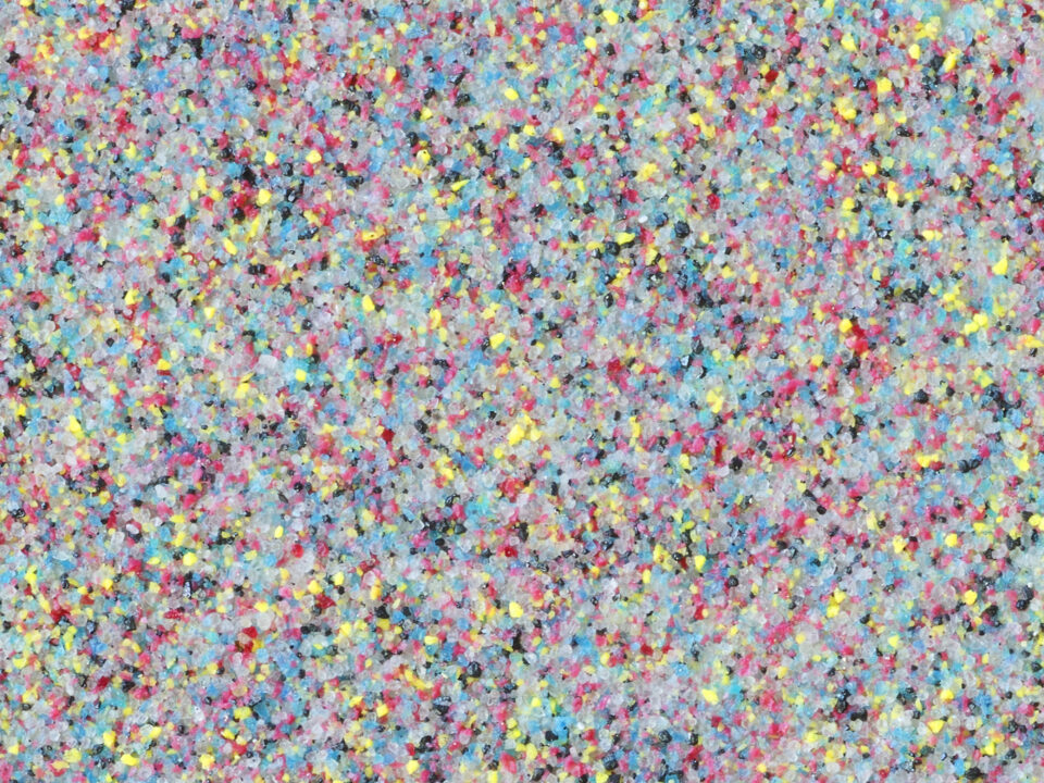 For C, M, and Y, we used powdered mineral pigments traditionally used in nihonga (traditional Japanese painting), and iron sand for K. With the walls coated in iron sand, prints can be attached with magnets. As the particles of C, M, Y, and K mix, the colour gradually shifts towards grey—much like dust on the floor, made up of tangled fibres in various colours, yet appearing grey.
