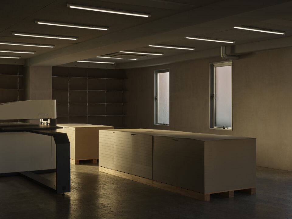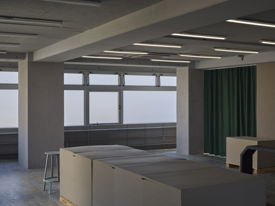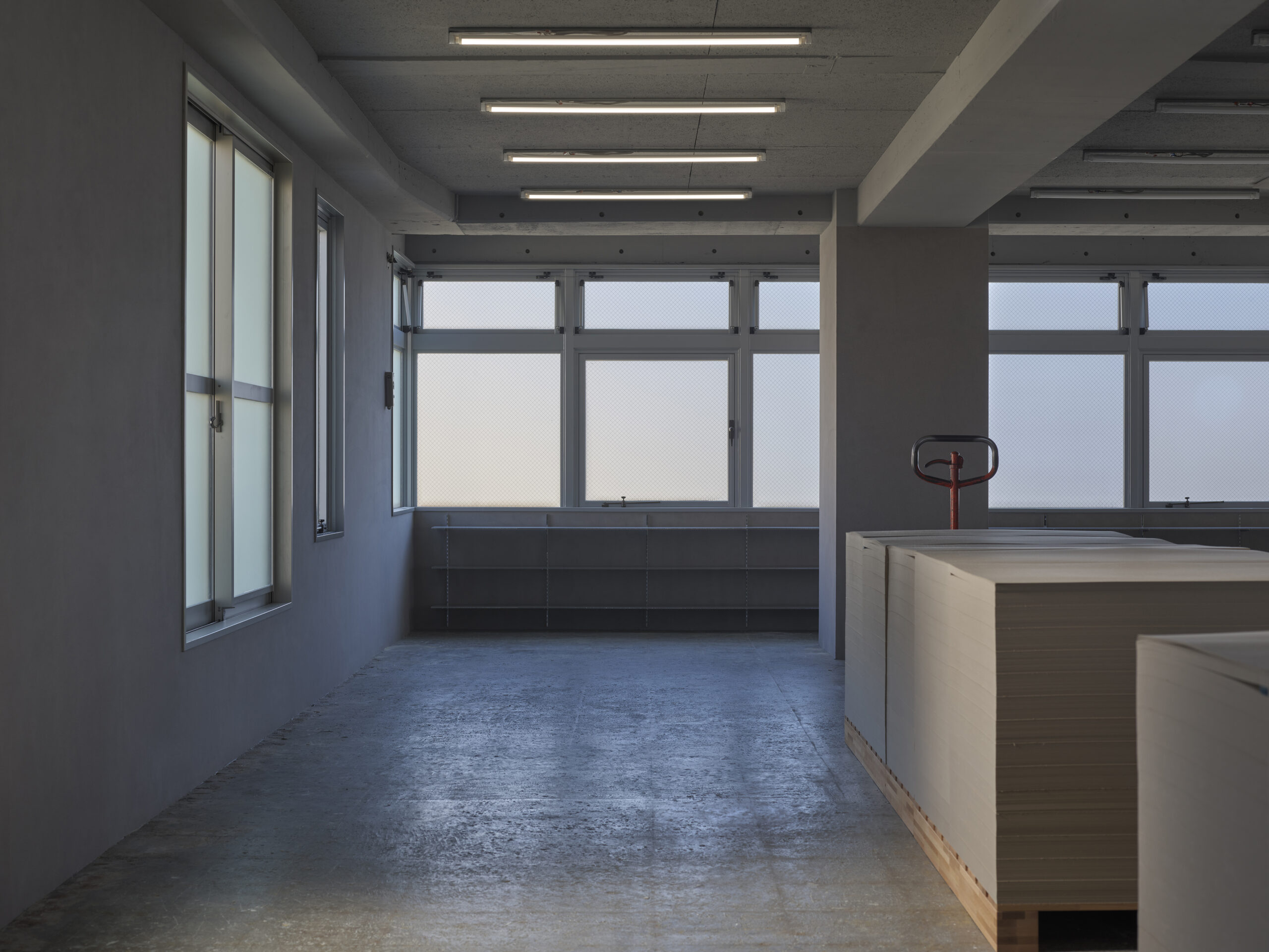 The stacked bundles of paper on wooden pallets, commonly seen in printing facilities, were repurposed as display stands and work tables. Placing artwork on top of them turns the space into a gallery; once you begin working on it, you find yourself in a workshop. If the top surface gets dirty, simply peel off a layer, and it’s as good as new. Each pallet weighs roughly 400 kg, but they can easily be moved with a manual forklift, a common sight in such environments. The space allows for easy use and rearrangement with simple, familiar gestures.