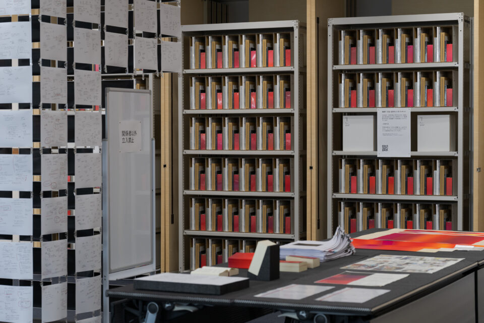 The venue was a Hakuhodo conference room, which is usually only open to related parties. The room had a system ceiling and carpet tiles. Whiteboards, OA furniture and fixtures. With the restriction that, in principle, no construction work could be done, the idea was to make use of the nostalgic atmosphere of a standard office space, and to make it work as an exhibition space. Most of the fixtures were provided by the conference room.