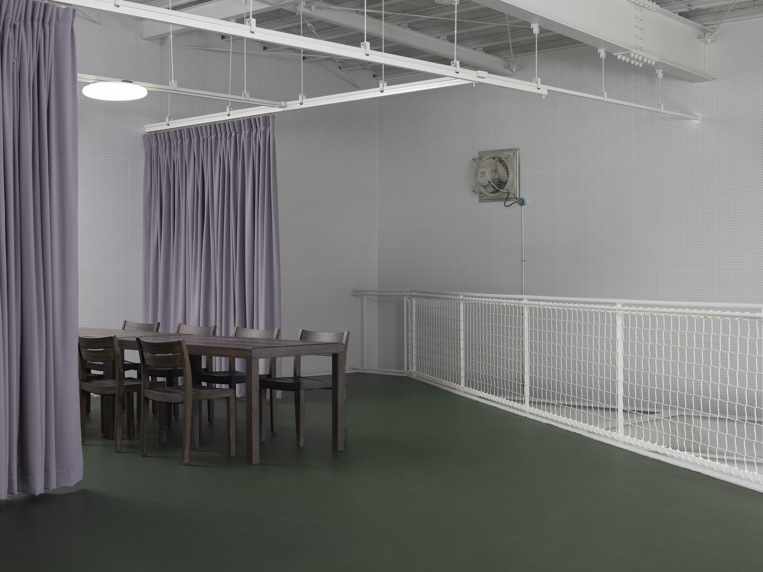 There was something intriguing about the idea of embracing the gymnasium atmosphere, preserving it deliberately, and forcing it into a new role as a factory. But that feels a little reckless. Having said that, completely erasing that presence and replacing it with something entirely new felt like a waste—and a great expenditure of energy, in more ways than one.