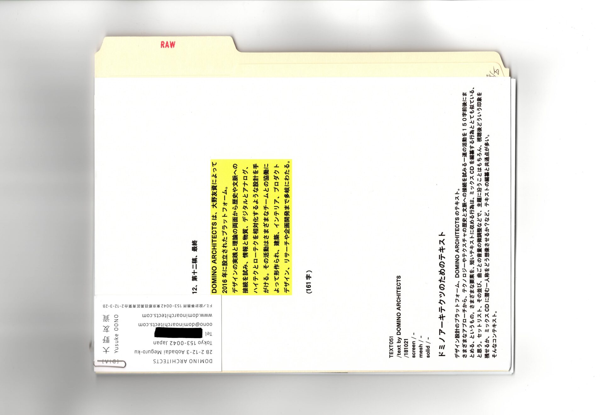 For each of the five projects, we produced a zine, “RAW,” in which multiple documents (documents, email correspondence, drawings and site photos) generated during the design process are bundled together as is and tucked into a folder. The manila folder used as the binding is one that is used in our office on a regular basis.