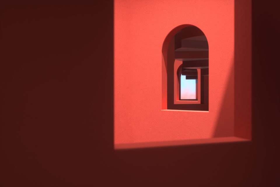 Our unique technique called “laptop photography” was used to visualize this building that exists only in the infosphere. By navigating the 3D data space through the monitor of the laptop, the composition and the camera lens are decided precisely, and the data of the lighting and the reflex board are carefully arranged like the real photo shoot. We created the visual of this illusional architecture by clicking on the application’s button, instead of hitting the shutter button.