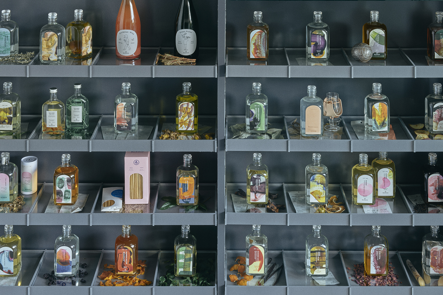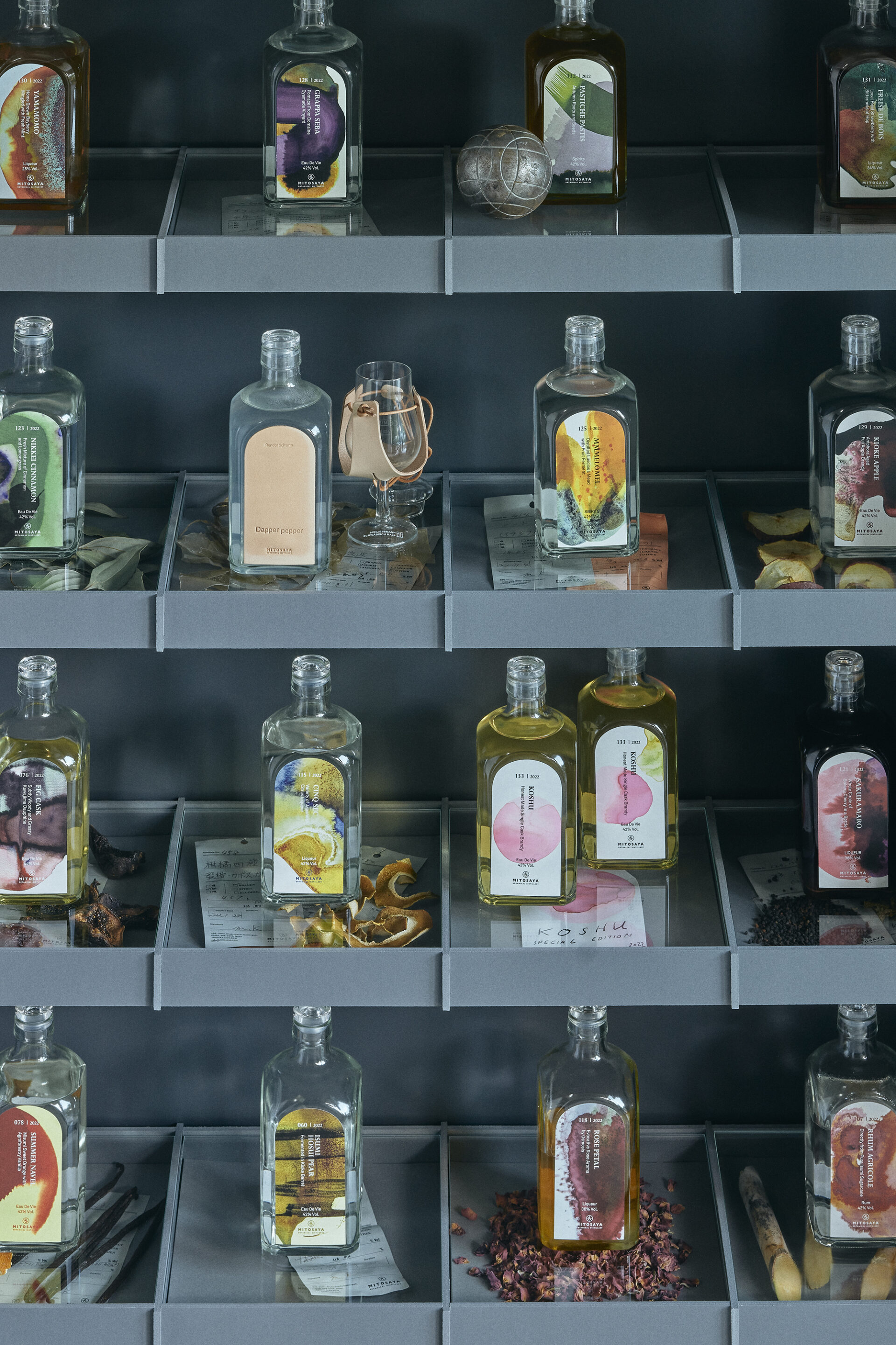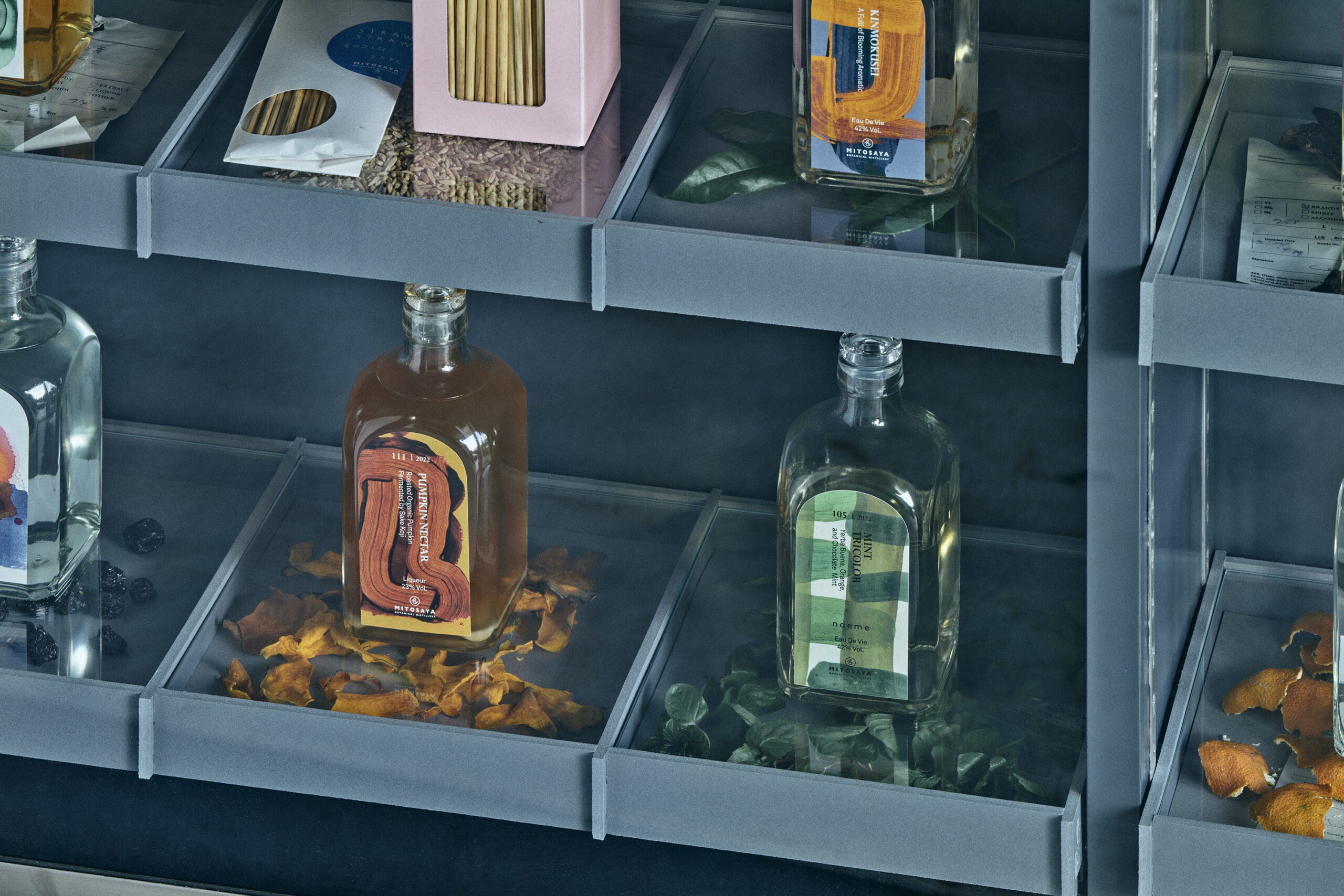 Shelf for displaying and viewing the distilleries Mitosaya has worked on so far.