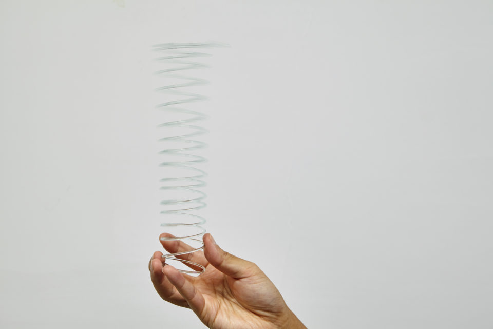 そんなことを考えながら、まるで生きているかのように揺れて動くバネ状のガラスを制作した。指で弾くと、ガラスの食器が擦れ合うように、ガチャガチャ音を立ててはしゃいだように跳ねる。