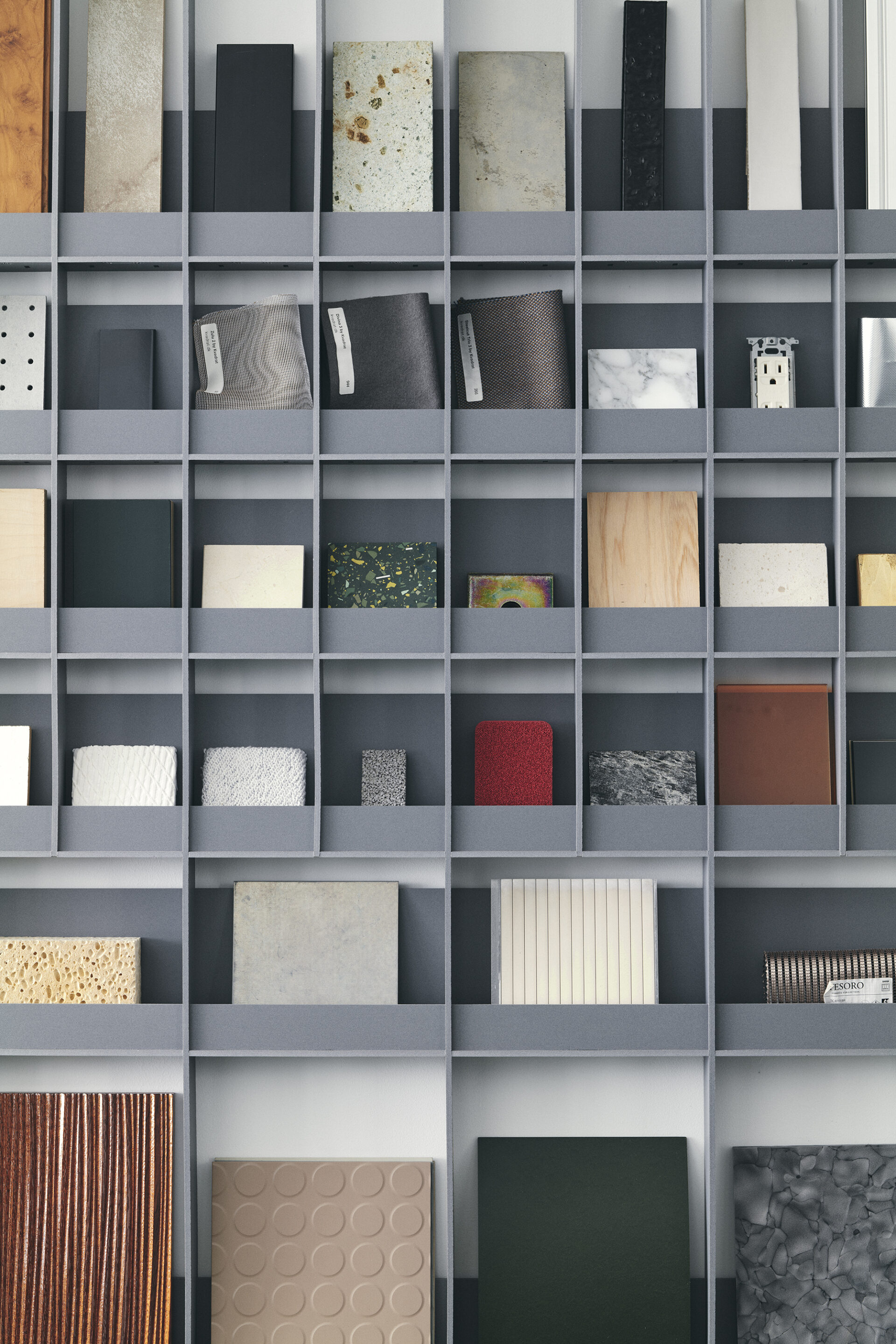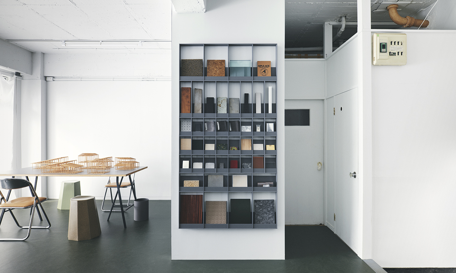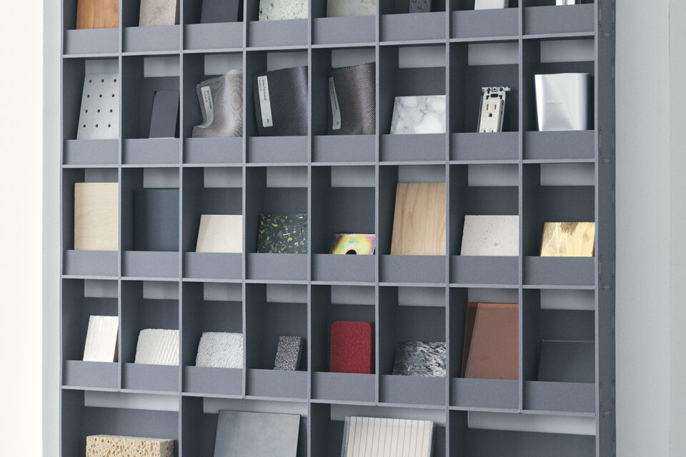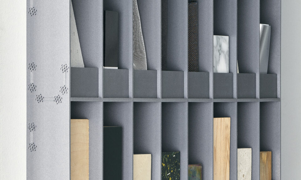 マテリアルサンプルを一枚の絵画みたいに並べるためのシェルフ。